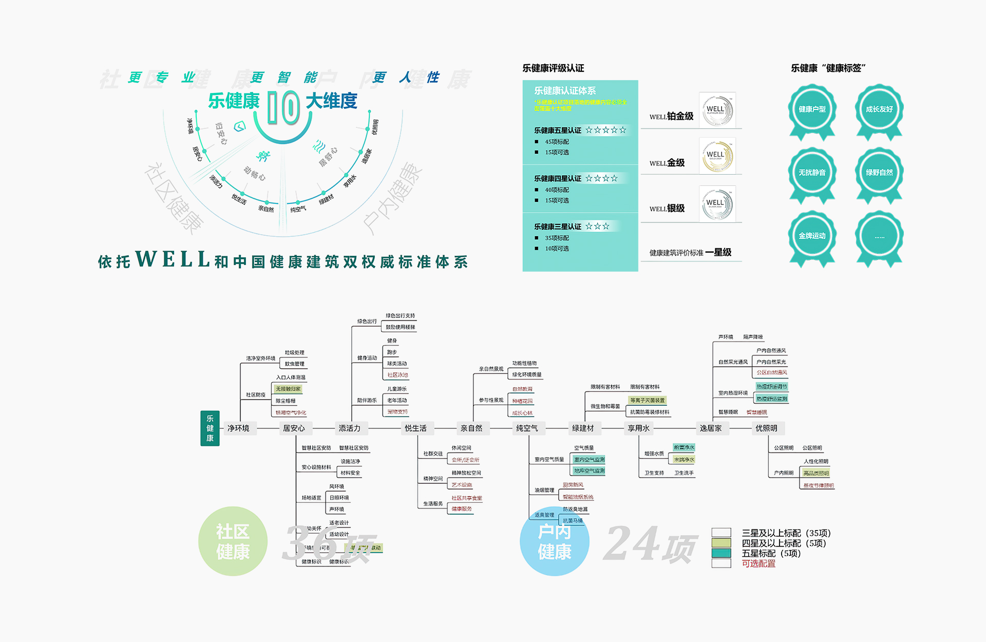 雅居乐健康住区评价标准共包含60项技术要点,按照三星/四星/五星进行分级。乐健康三星作为我们健康产品底线包含35项标配项,10项选配项,对标WELL银级、中国健康标一星设计要求;五星作为我们的最高配置标准,包含50项标配项,10项选配项,对标WELL铂金级设计要求。