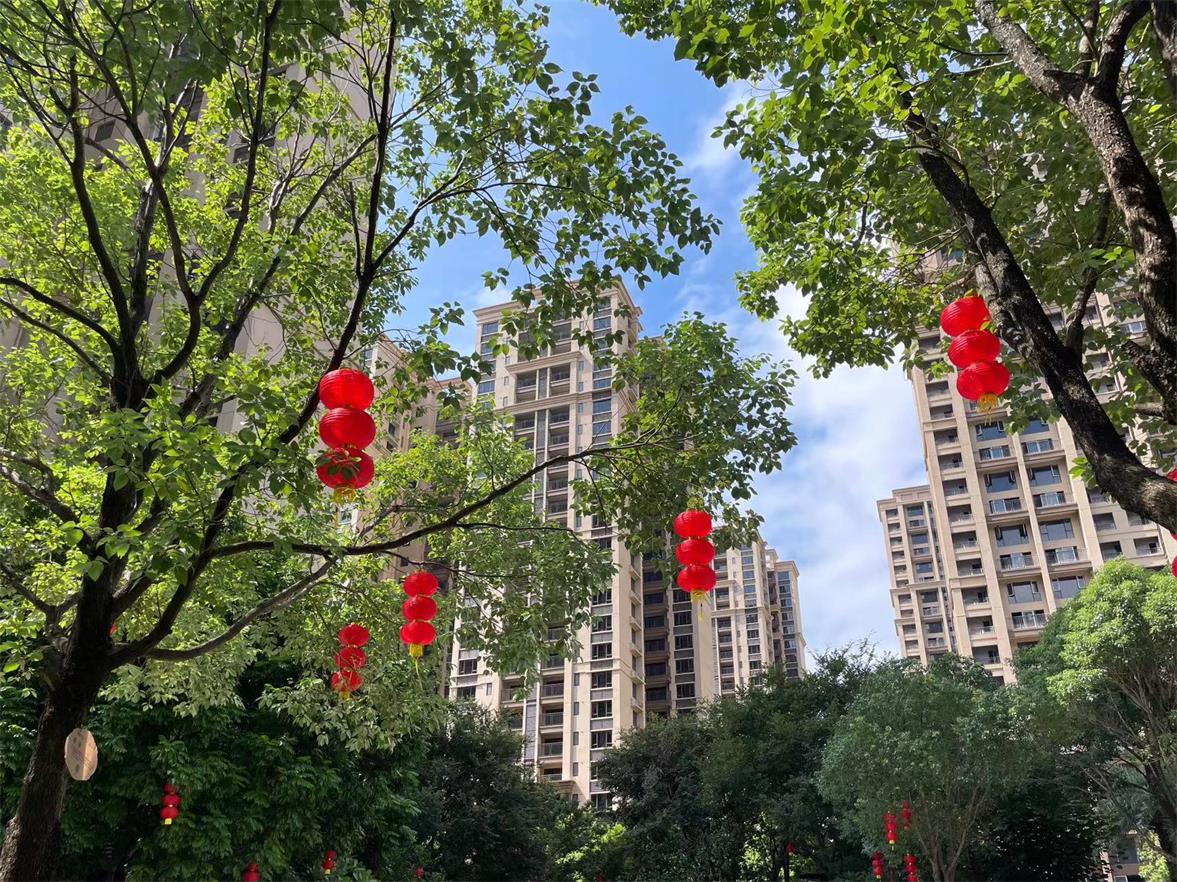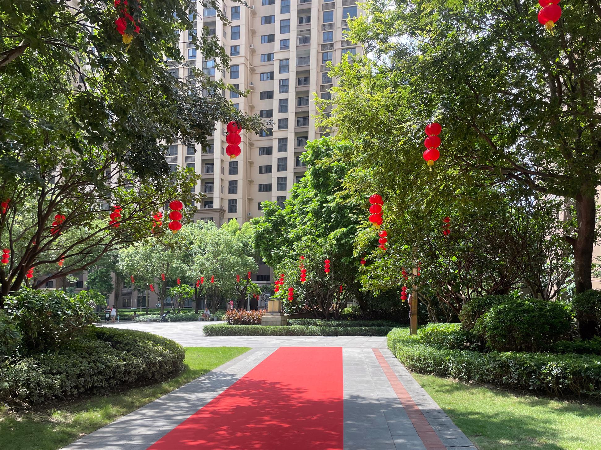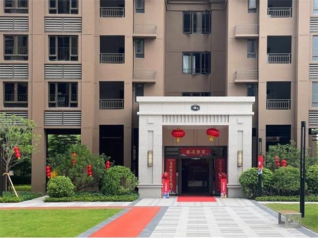交付当天,项目现场进行了精心的布置,红色地毯、欢迎归家立牌和鲜花,典雅又时尚,衬托出交房的喜悦感和仪式感。简约大气的外立面,园林绿化青葱茂密,错落排布、移步异景。
